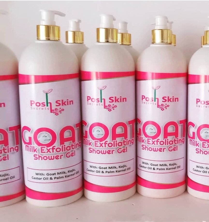 Our GOATMILK EXFOLIATING SHOWER GEL is infused with : Goatmilk, Palm Kernel Oil, Kojic Acid, Castor and Egptian oil. It lightens.